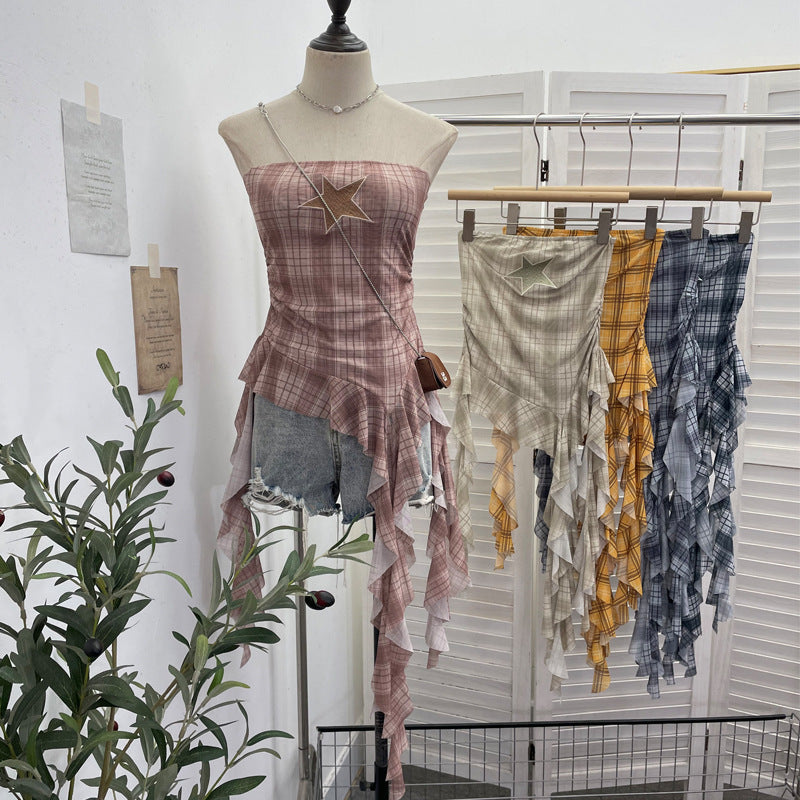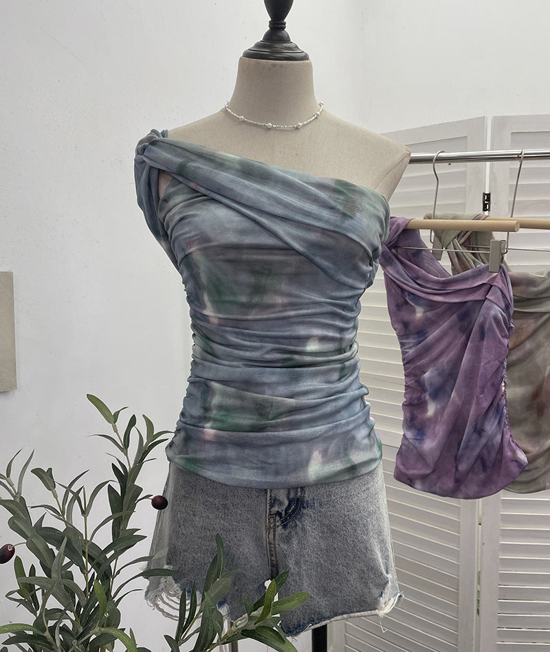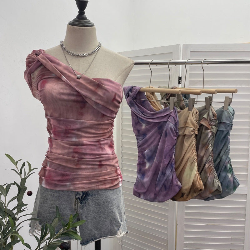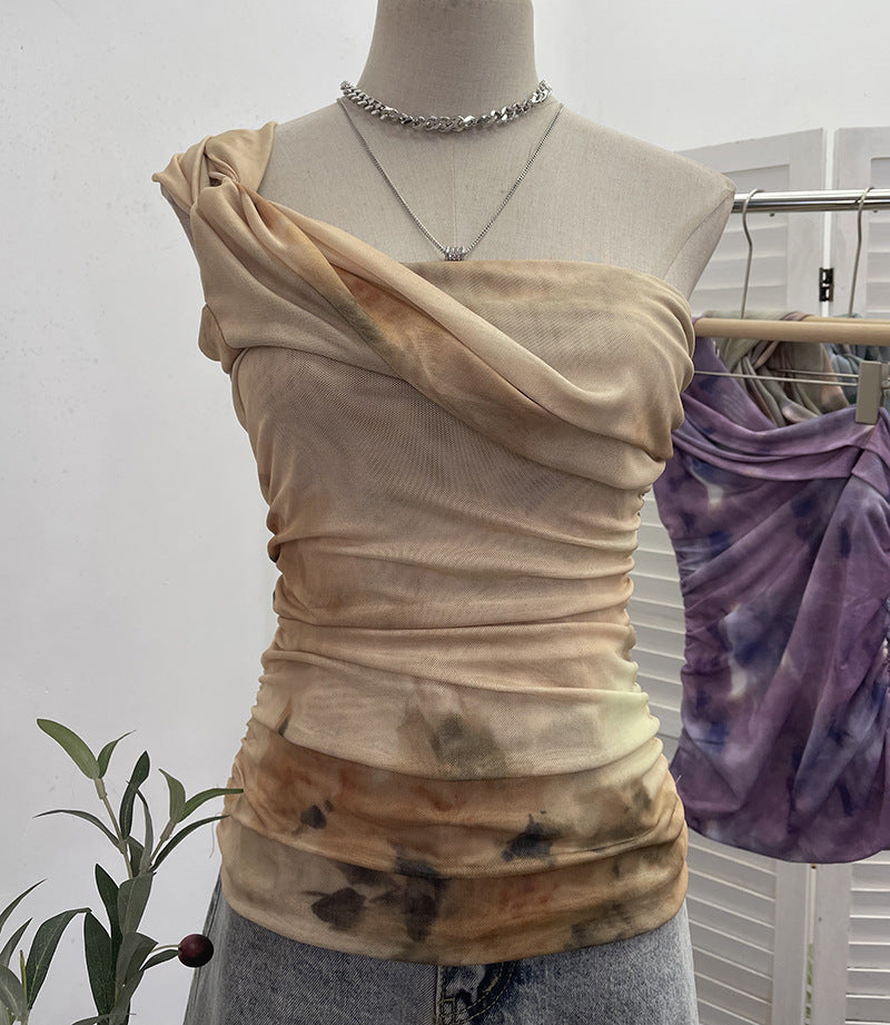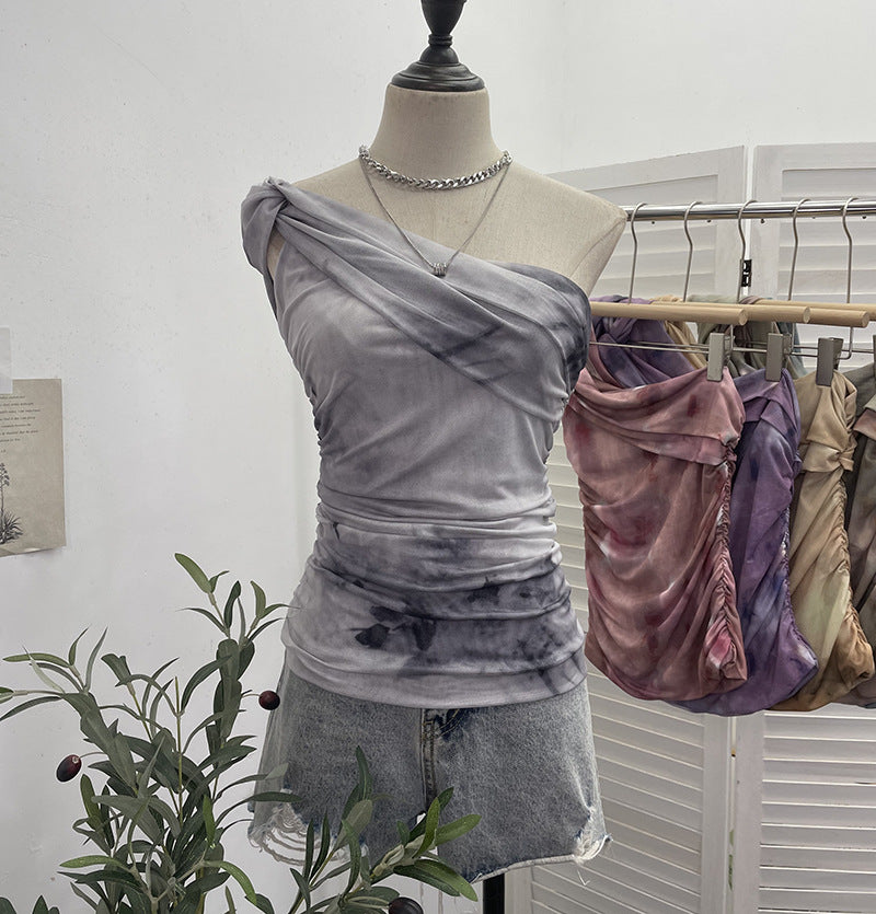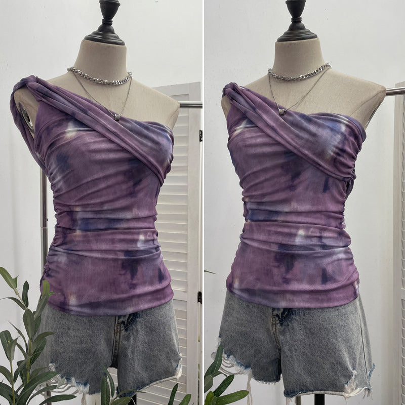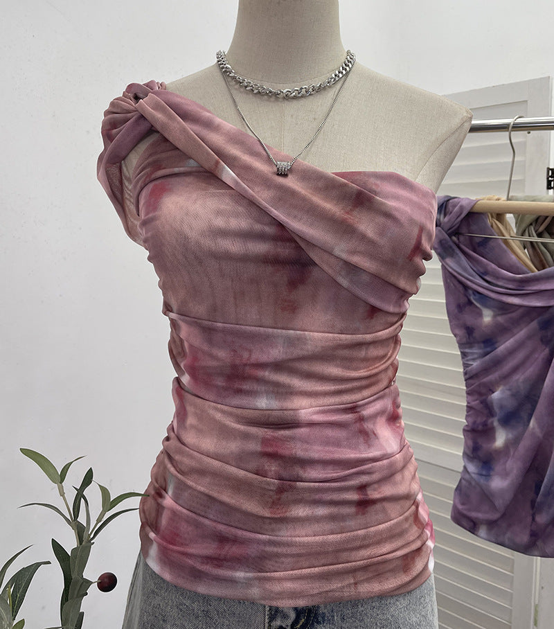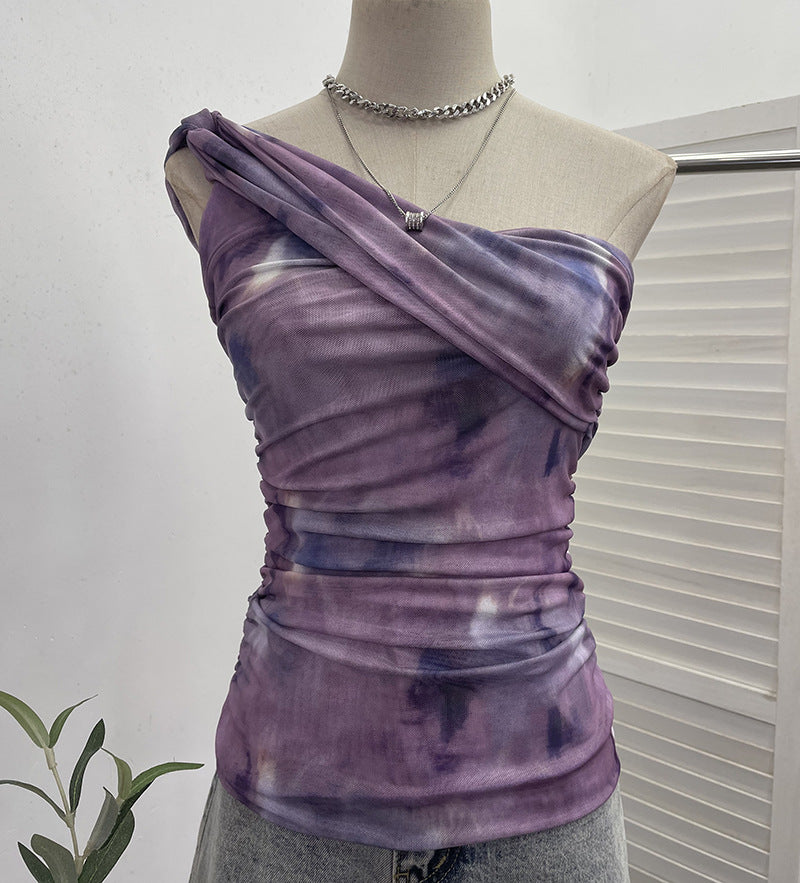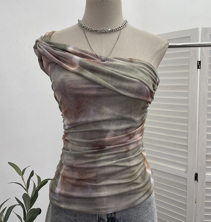 Net Yarn Printed Slanted Shoulder Sling Vest Retro Design Folding Temperament Short Blouse 8009 HZ1208