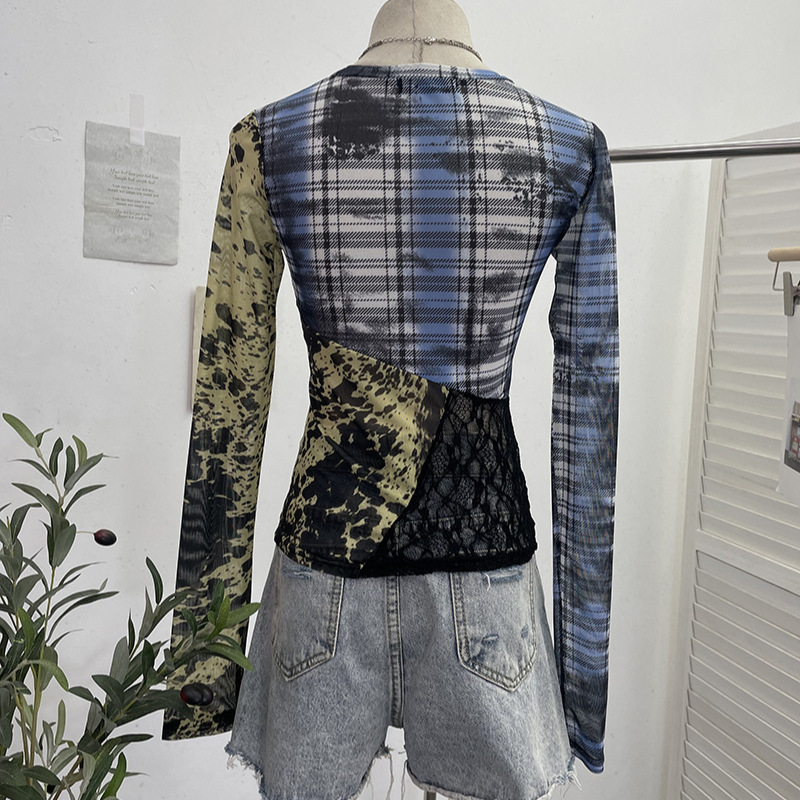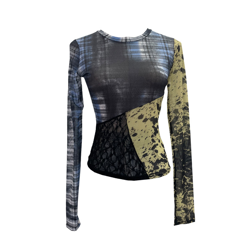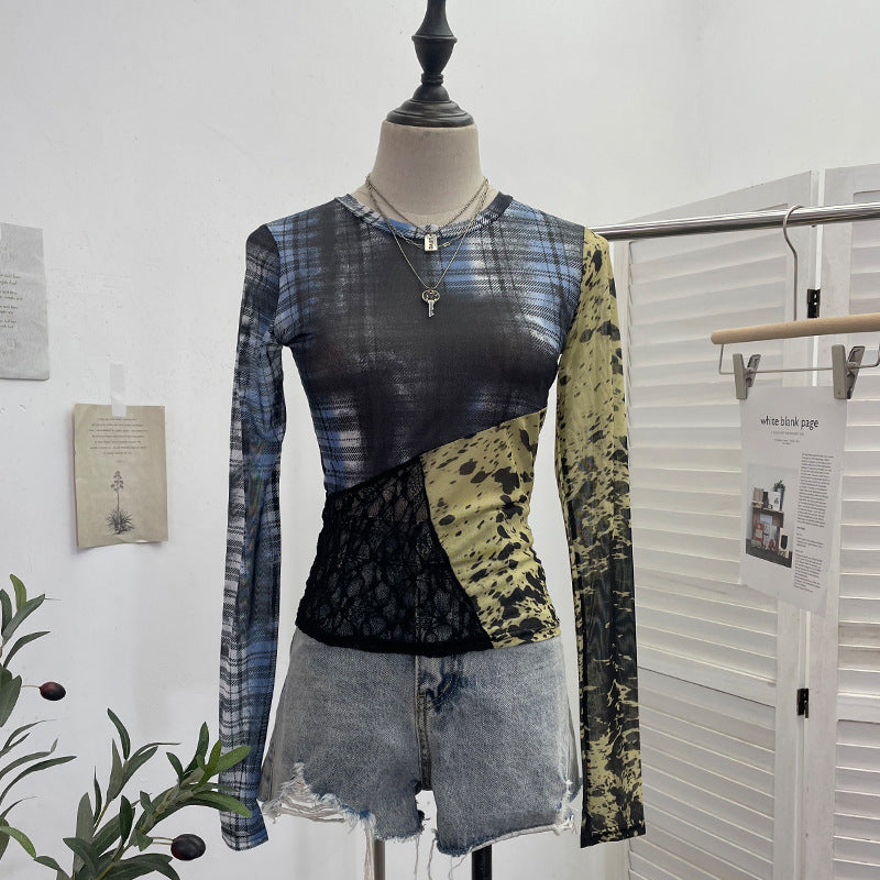Pictsey Tat Yarn Print Bottom Blouse Spliced Lace Long-Sleeved T-Shirt 22917 HZ1208