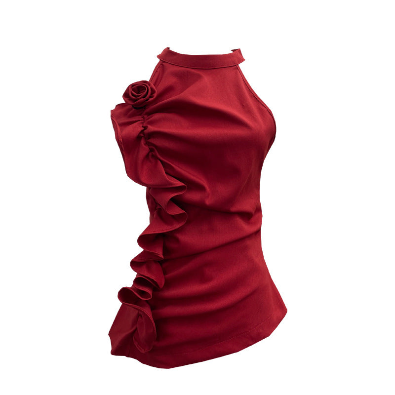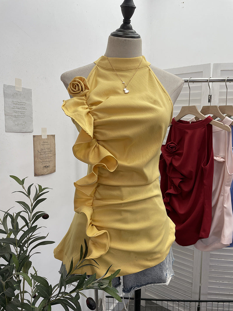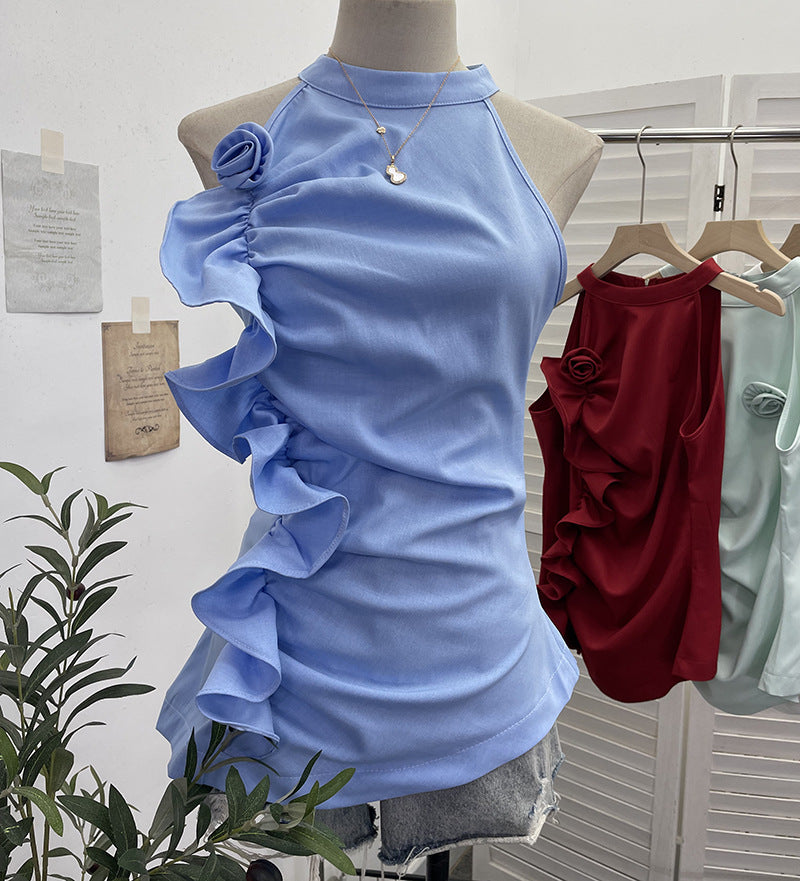 Spicy Design Sleeveless Leaves Three-Dimensional Flower Blouse Atmosphere Slimming Waist 1166 HZ1208