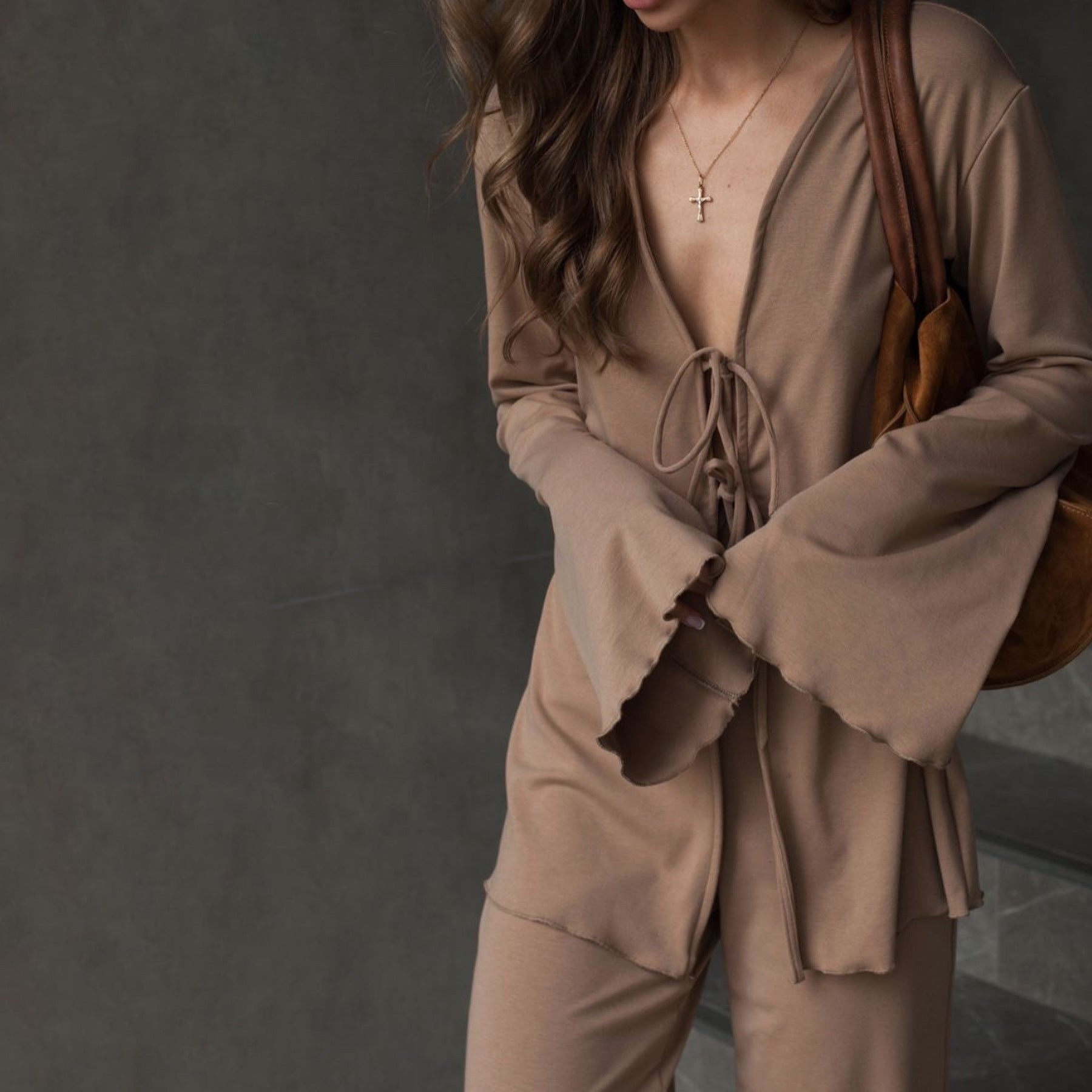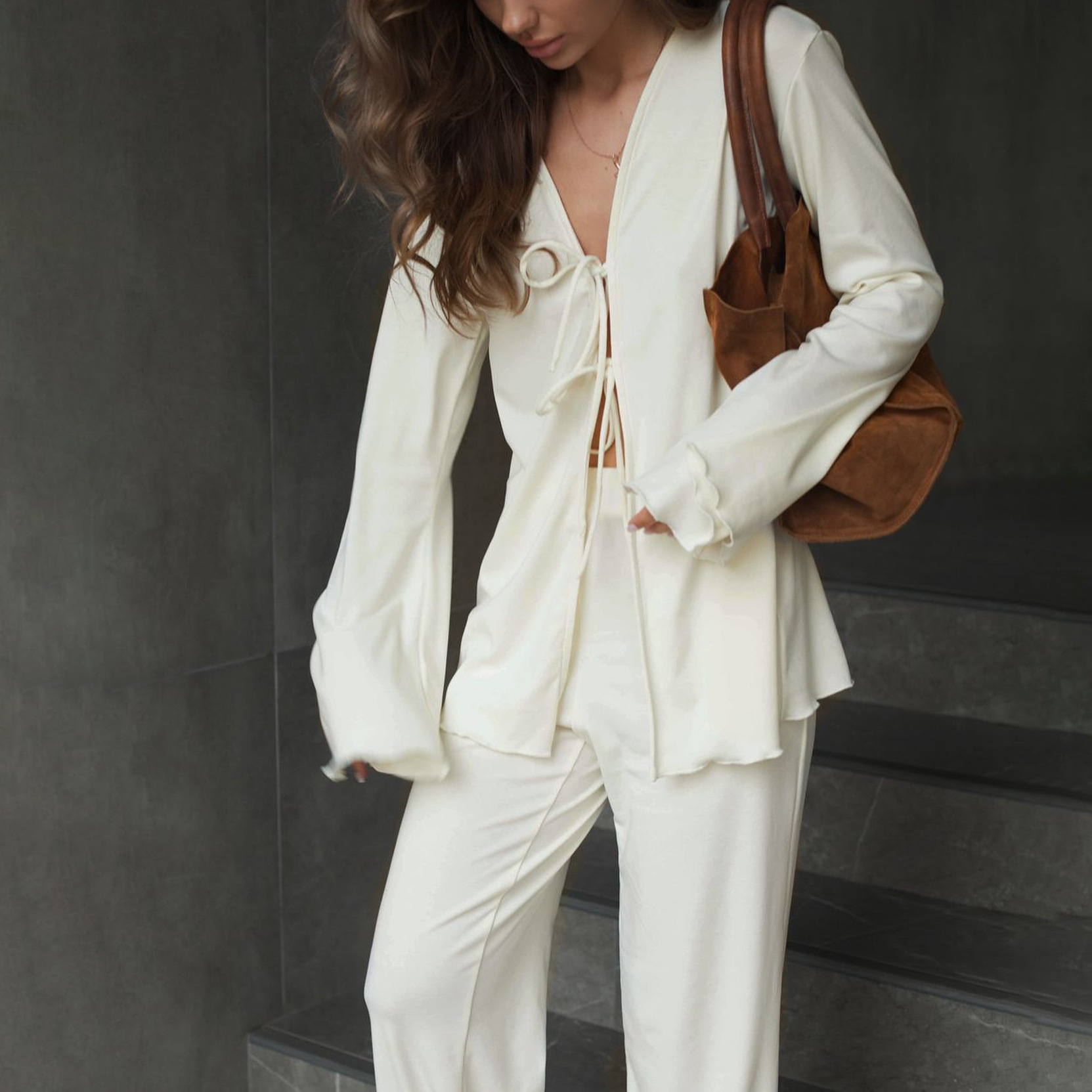 Fashion Casual Light And Thin Tight With Horn Sleeves Loose Waist Straight Trousers Knitting Set Spring And Autumn HZ1208