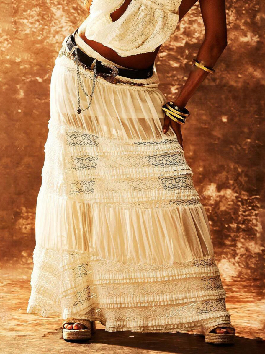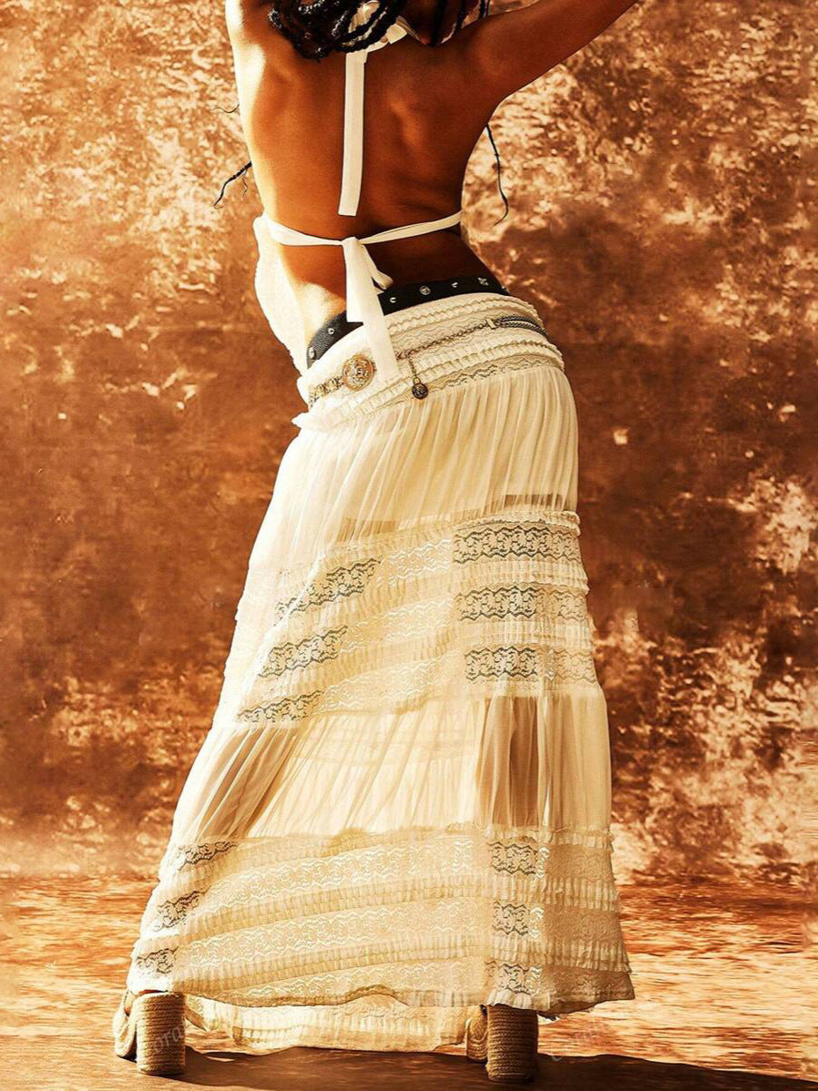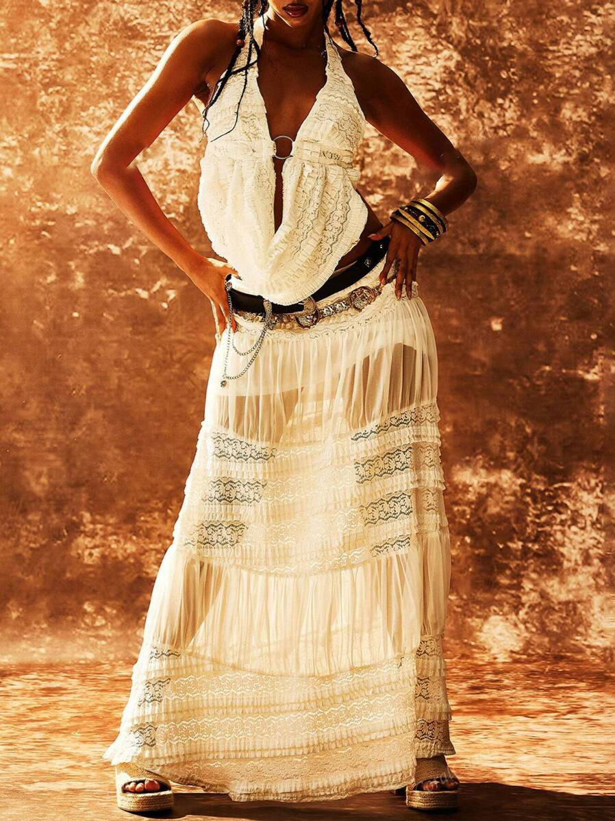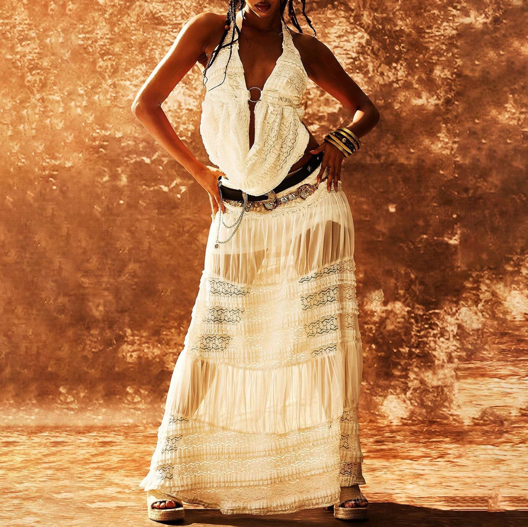 Vacation Style Lace Mesh Splicing Sleeveless Suit Dress Niche Design High-End Hanging Neck Splicing Skirt Women's Clothing HZ1208