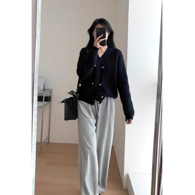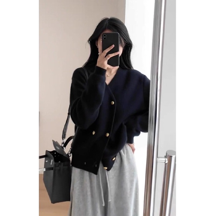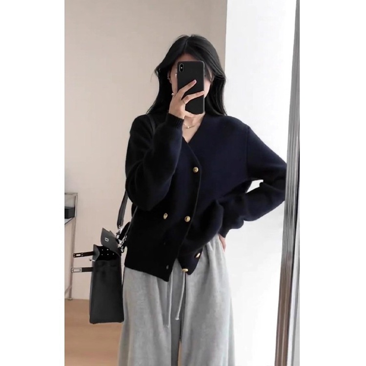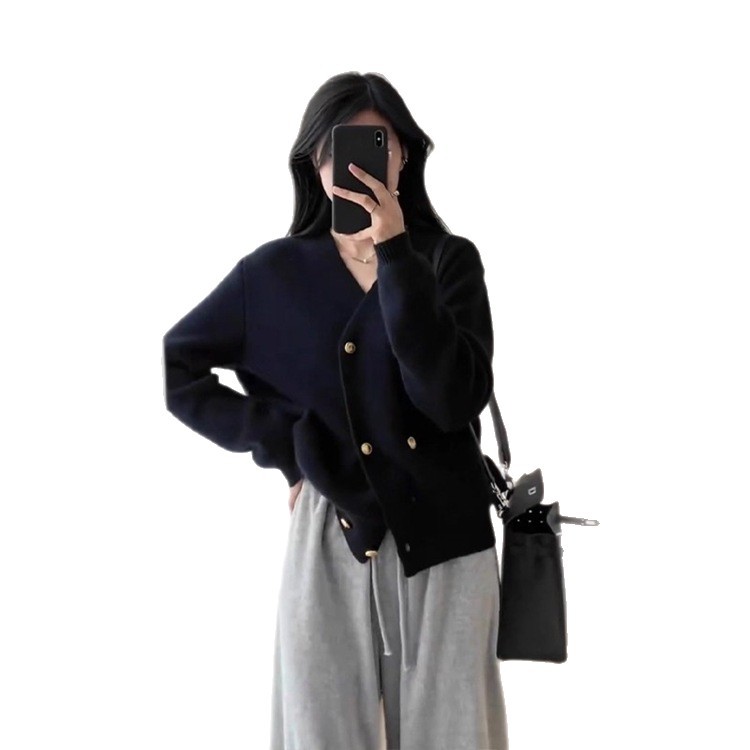 Autumn And Winter French Retro Black V-Neck Sweater Girl Languid Retro Knitted Jacket Top HZ1208