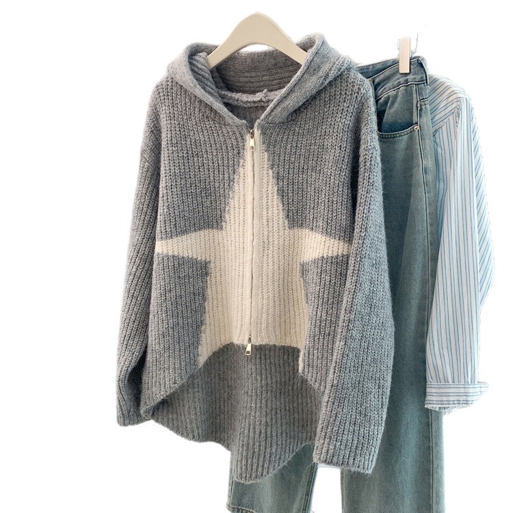 Korean Design Sense Of The Star Short-Sleeved Hooded Knitted Sweater Women's Autumn And Winter Slim Clothes HZ1208