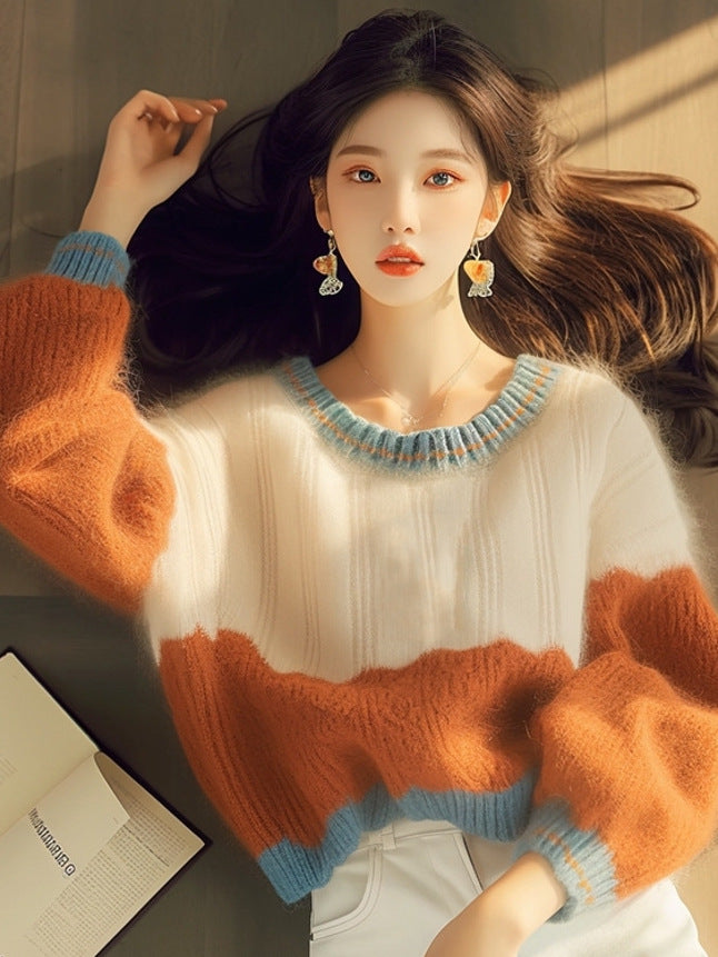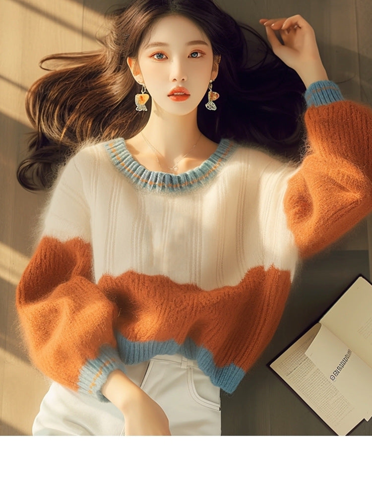 Orange Stitched-In Printed Knitted Sweater 2025 Autumn And Winter New Korean Niche Design Soft-Clip Collar Top HZ1208