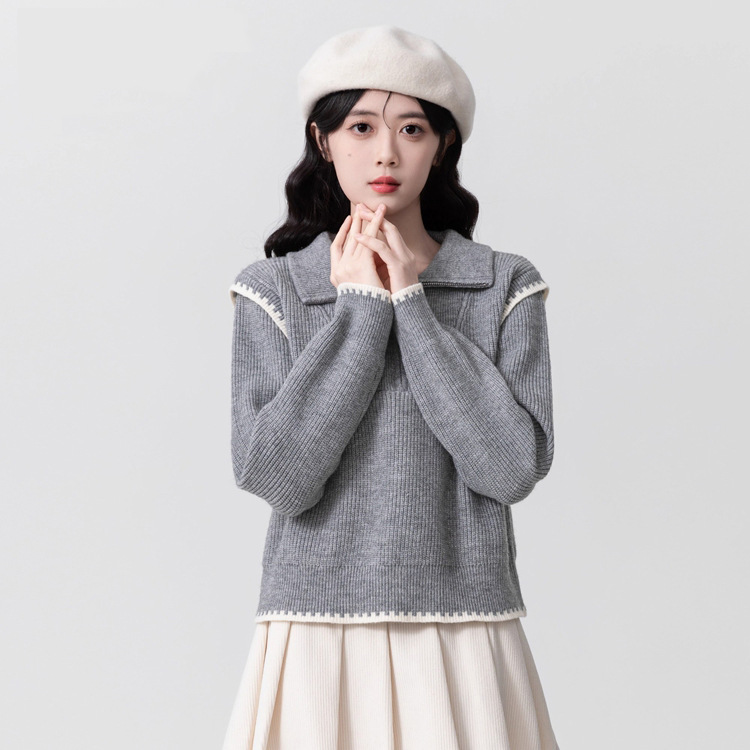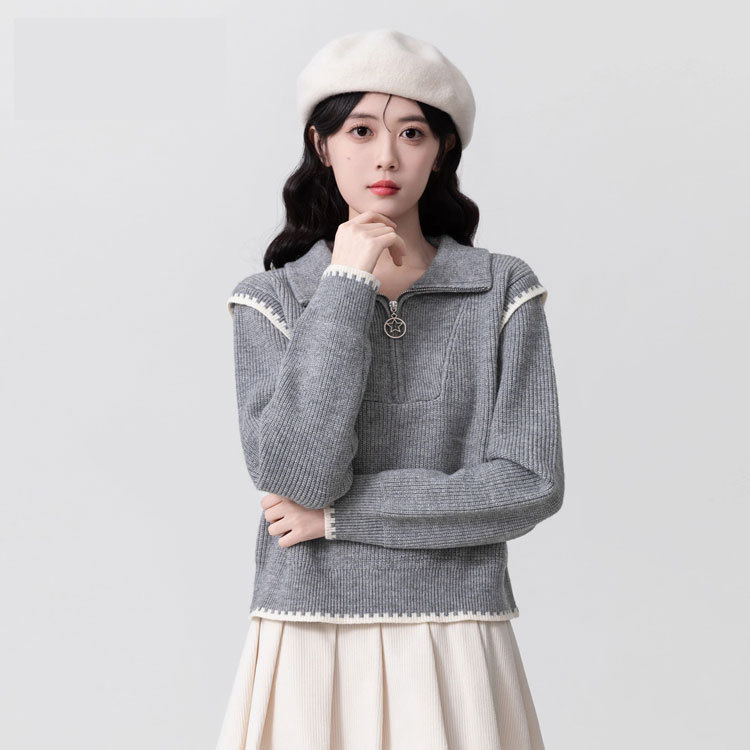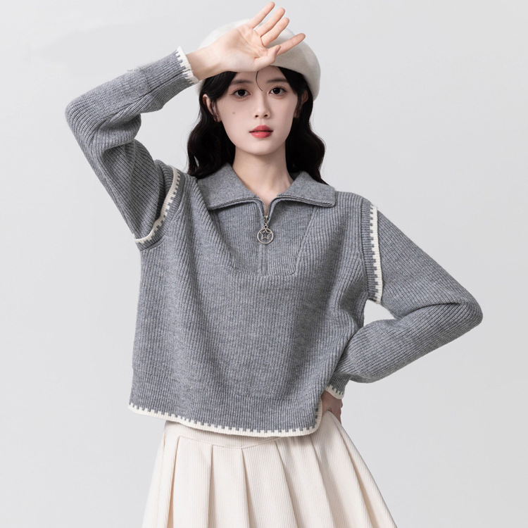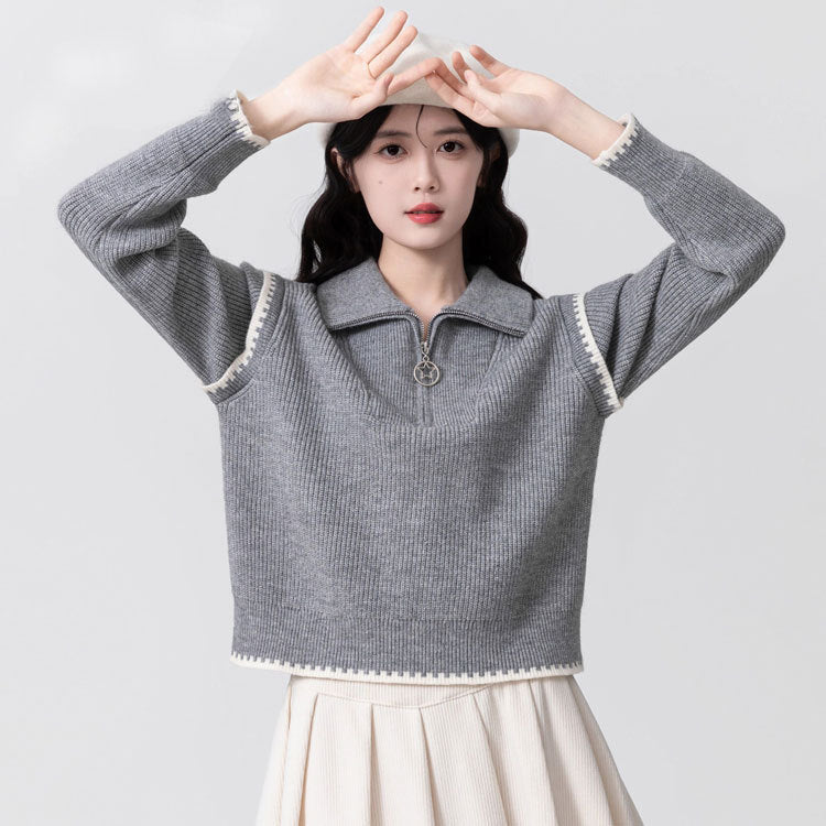 Zippered Turtleneck Sweater Women's New Winter Splicing Knitted Jersey Loose Design Top HZ1208