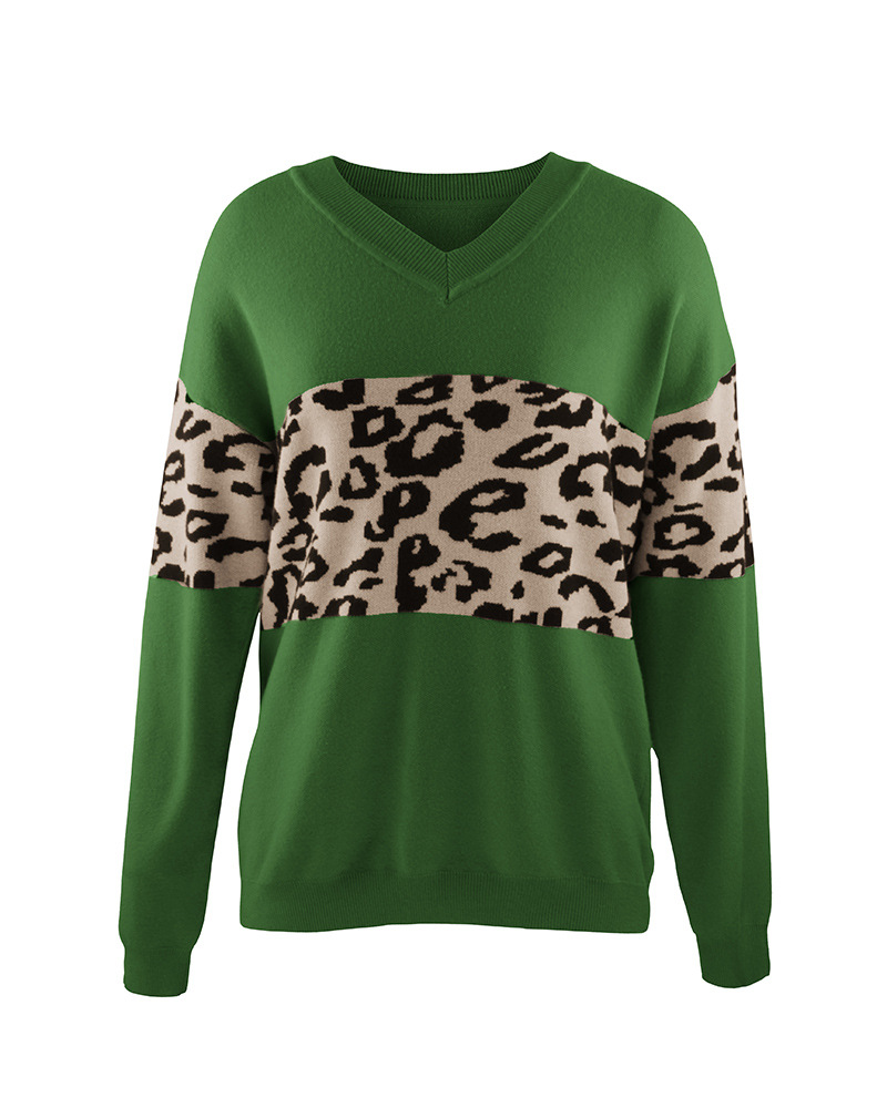 2025 Autumn And Winter New V-Neck Spliced Knitted Shirt Women's Jacket Leopard Print Women's Sweater HZ1208