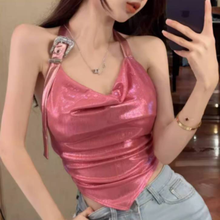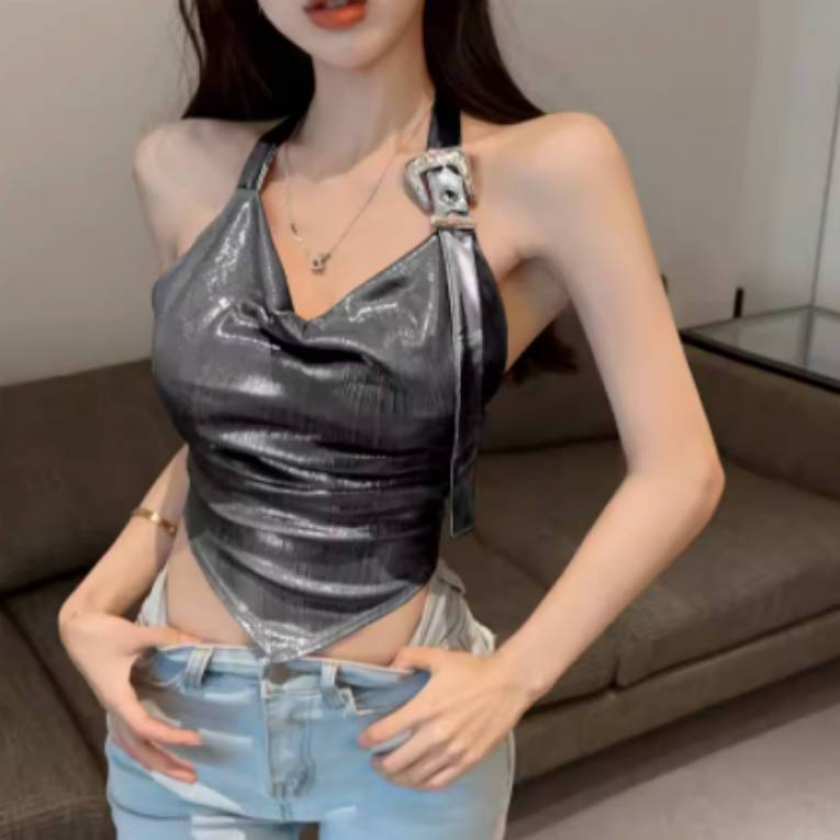 2025 Autumn Cool Sister Hanging Neck Sling Female Bright Folding Design Hot Girl Short-Term Vest Sexy Top HZ1208