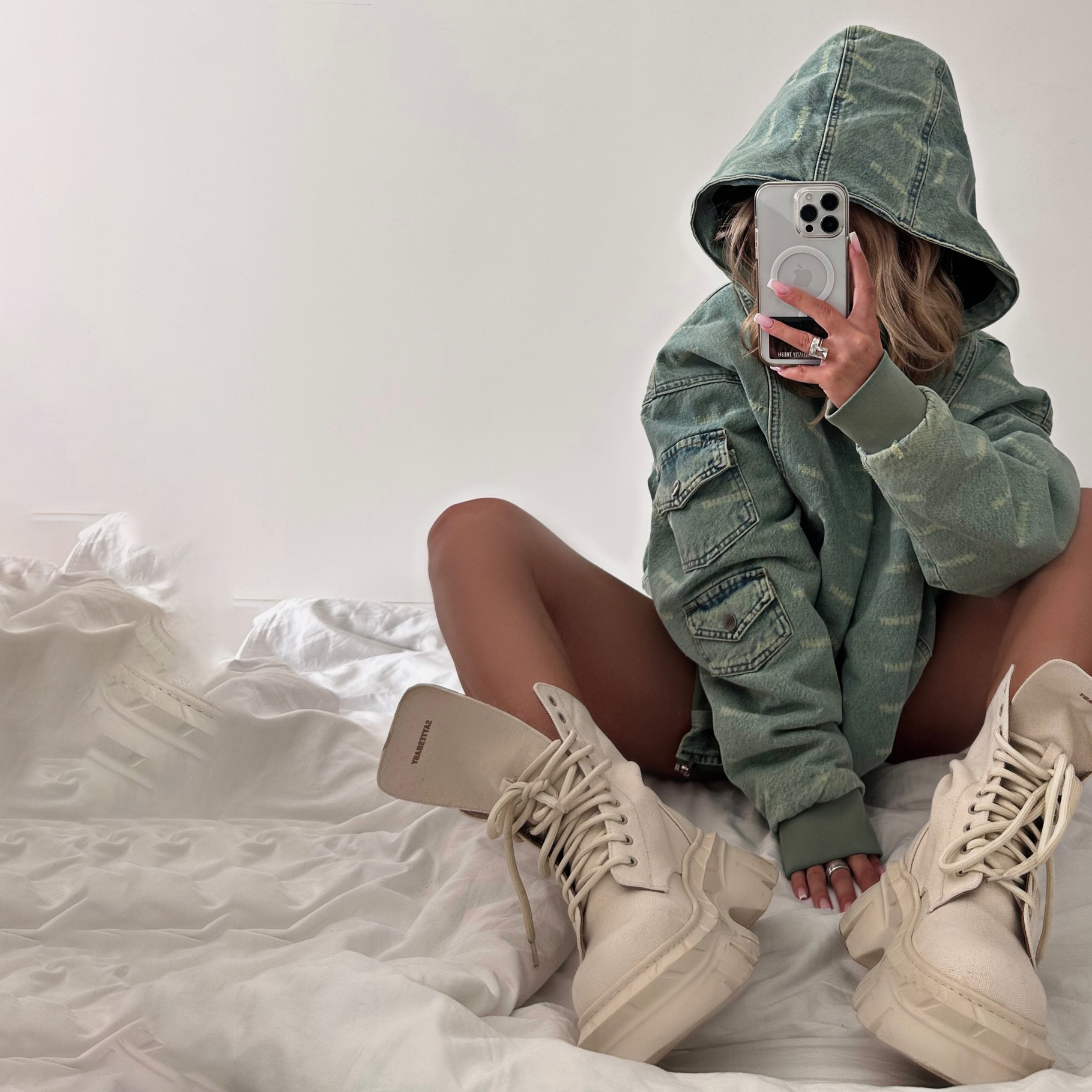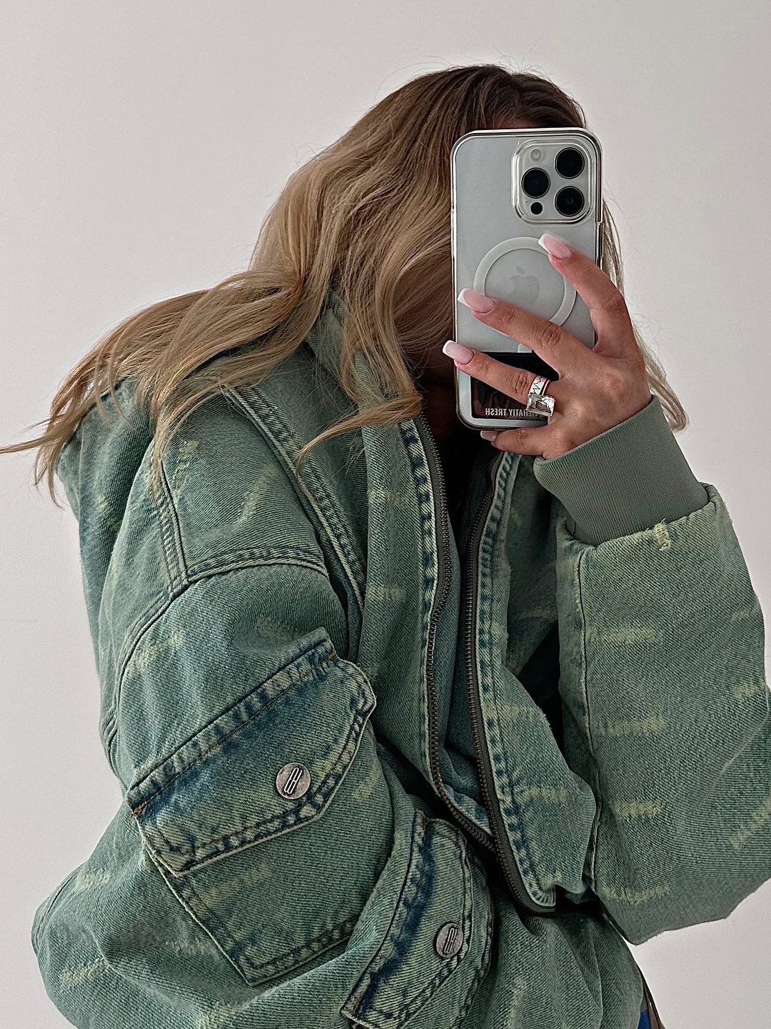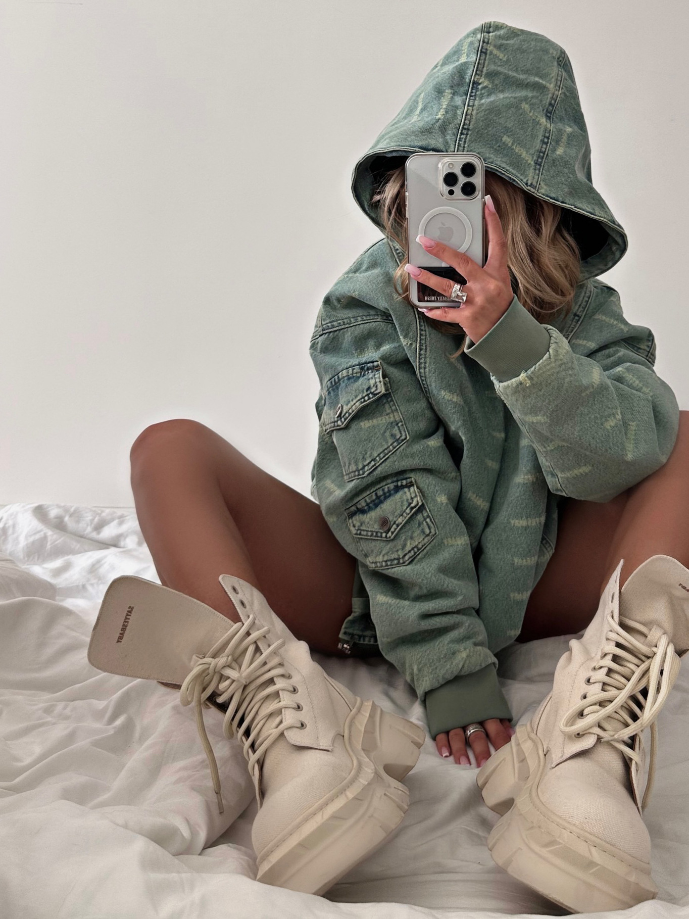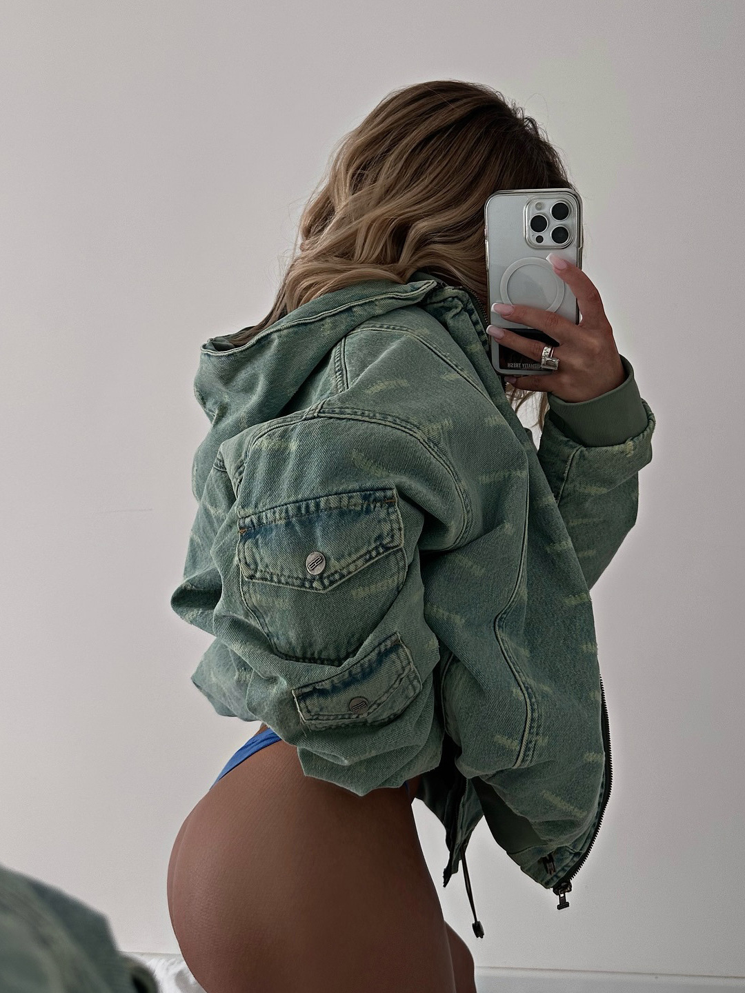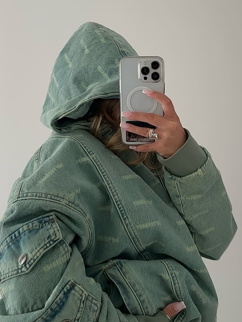 Exploding Retro Green Wear Denim Hooded Cotton Clothes Women Multi-Pocket Workwear Style Loose Version Of Autumn And Winter Fashion HZ1208