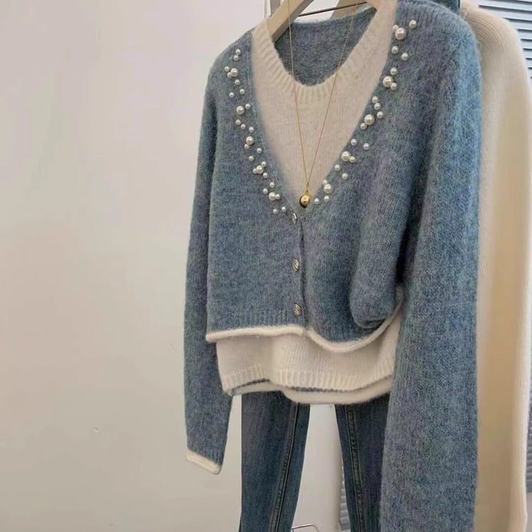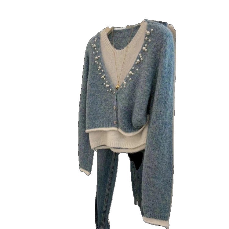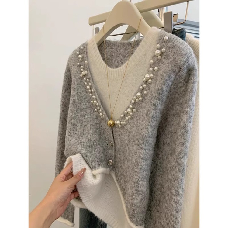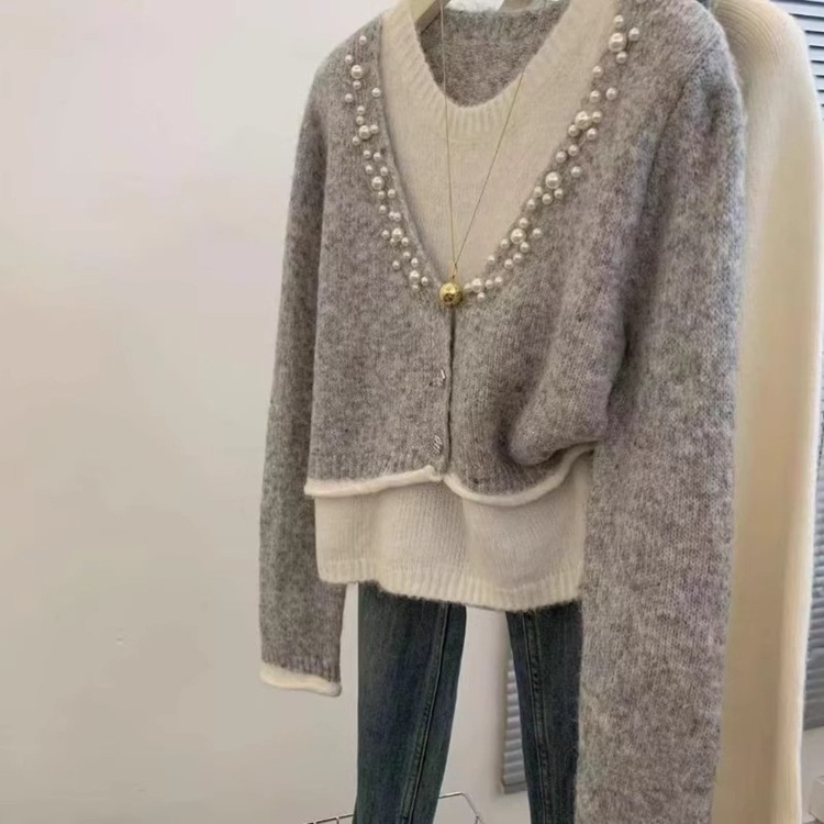 Grey Folded Fake Two-Piece Top Female Hooded Temperament Knitted Sweater Lazy Style Design Sense Of Niche 2025 New HZ1208