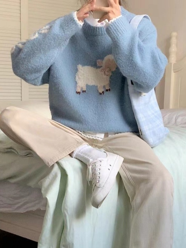 Lazy Goat Round-Neck Blue Sweater Women's Autumn And Winter New Three-Dimensional Bow Short Soft Glutinous Knitted Shirt Top HZ1208