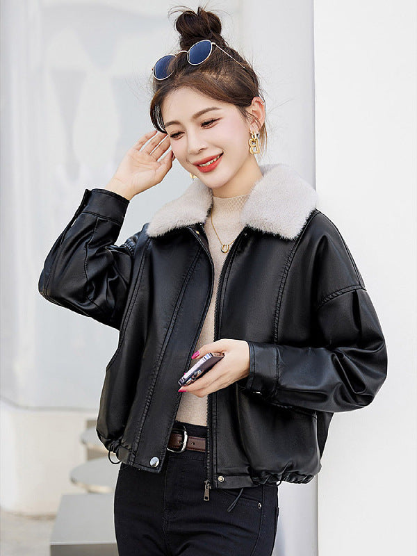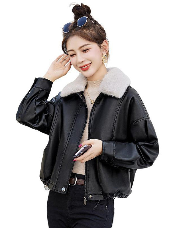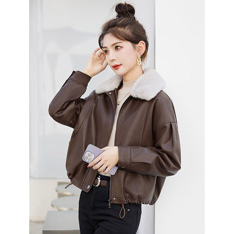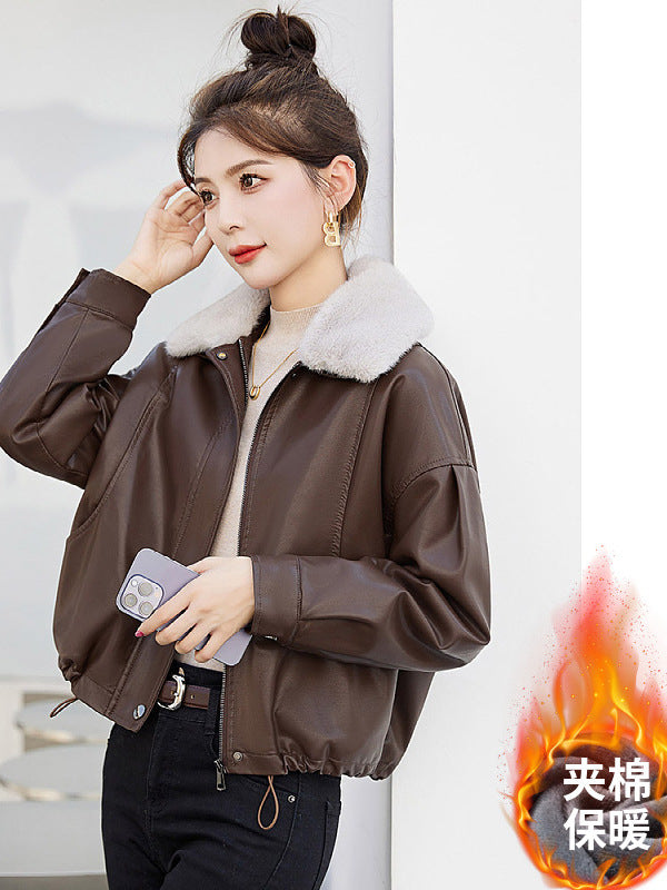 Popular Fur Collar Plus Velvet Coat Women 2025 Winter New Small Loose PU Locomotive Jacket Jacket HZ1208