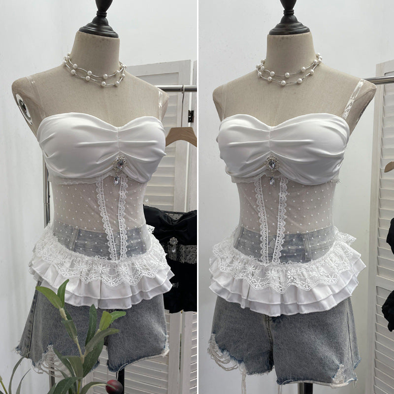 Purely Eager Heavy-Working Transduce Mesh Lace Spliced Ribbon Ribbon Strap Chest Pad Tector Blouse 2721 HZ1208