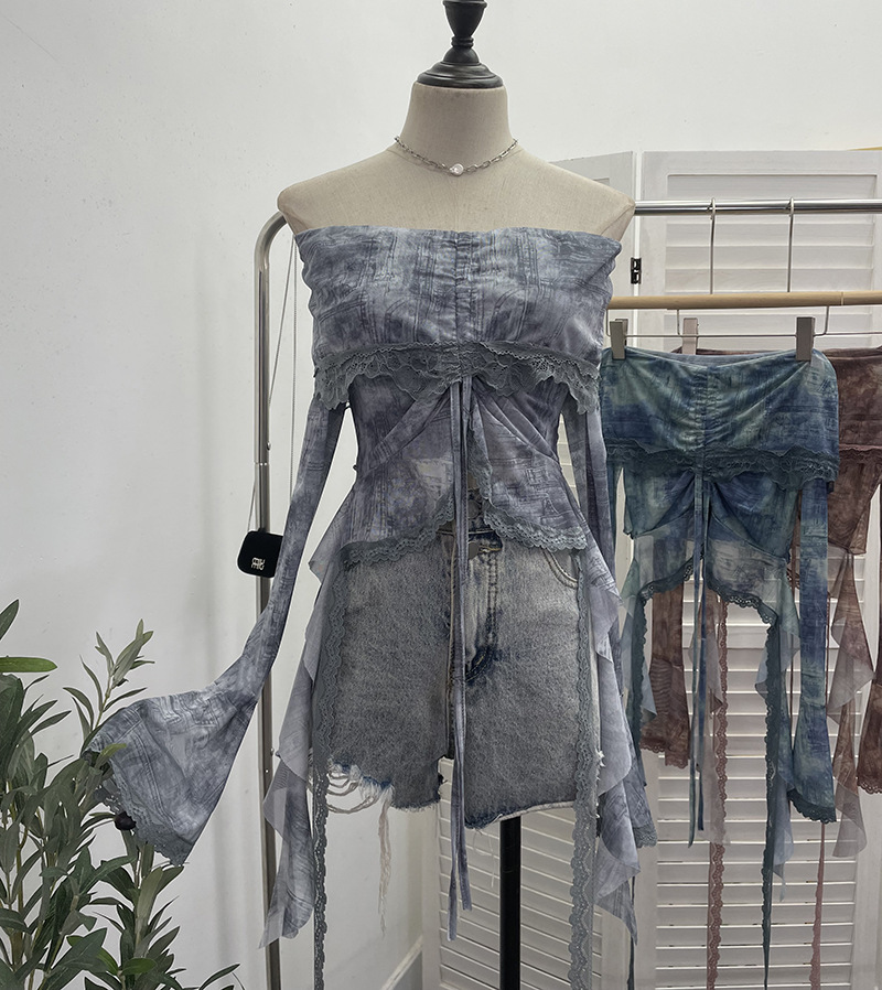 Small-Sized Old-Fashioned Green Shoulder Horn Sleeve Blouse Dye Net Yarn Lace Draw Rope Short T-Shirt 8010 HZ1208