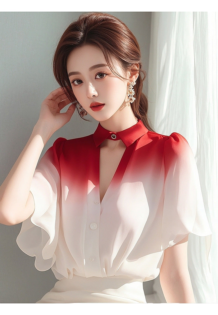 This Year's Popular Unique Beautiful Gradient Shirt Female Light Familiar French Small Short-Sleeved Fairy Air Fluttering Snowfleet Blouse Summer HZ1208