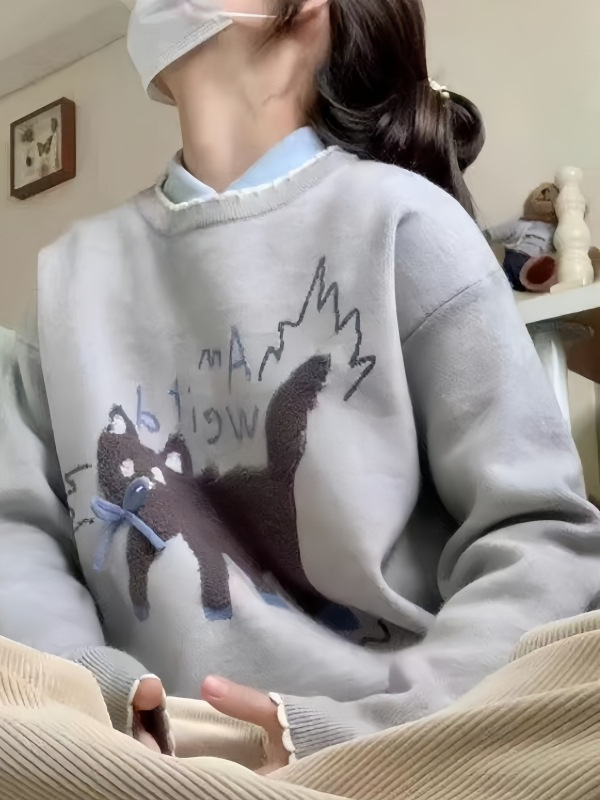 Vintage Academy Wind Knitted Sweater Woman Design Sensing Cat Pattern Lazy Small Knitted T-Shirt Winter HZ1208